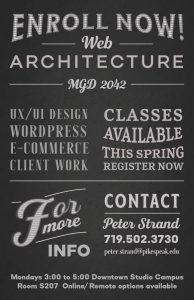 Roles include web designer in ITSS, Marketing assistant, adjunct and MGD Department Chair. The following pieces represent marketing collateral, student project announcements and teaching aids.